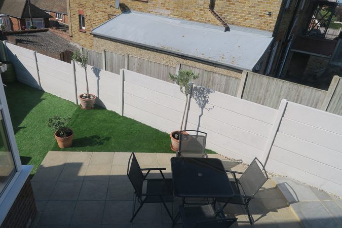 New redesigned pretty s level patio garden, gated so safe for children. Two garden tables, one on each level and six chairs and BBQ. Mature garden bordering patio areas. Lovely Pear Tree, help yourself to sweet crispy pears straight from the tree. Washing line. Small shed. Padlocked gate. Newly paved front path and side path to garden.